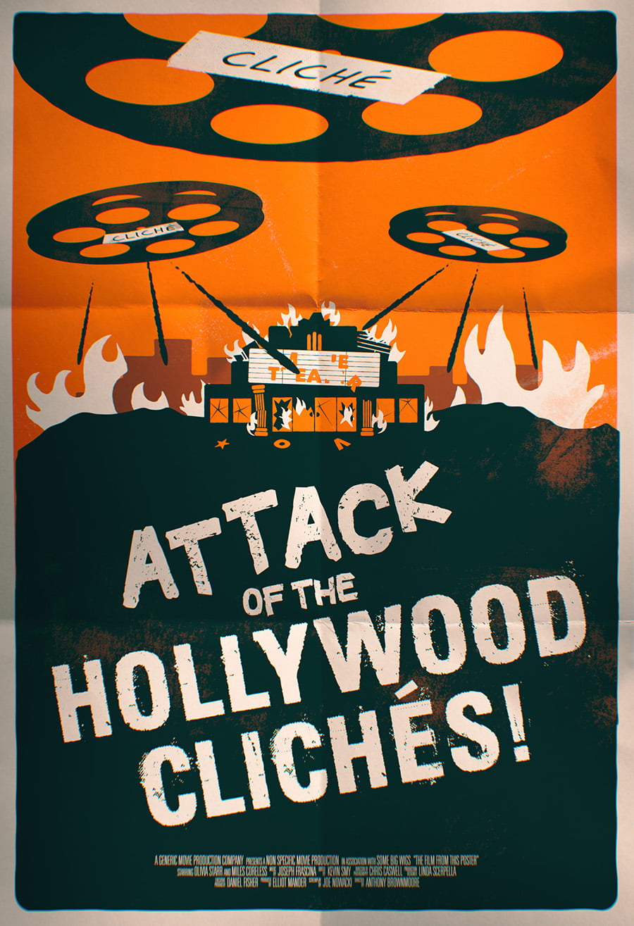 For our design inspiration we looked to the ever increasing trend of the ‘alternative movie poster’. A sub genre of movie poster design, which over recent years has become ever so popular, allowing artists and designers to re-imagine and create their own versions of their beloved film posters. Building from this inspiration we created movie posters and billboard designs for every cliche that featured in the film. Boiling the cliché down to its simplest form, incorporating simple graphical elements which were cleverly positioned or connected to create deeper visual meanings whilst also allowing us to infuse fun and humour into the designs.